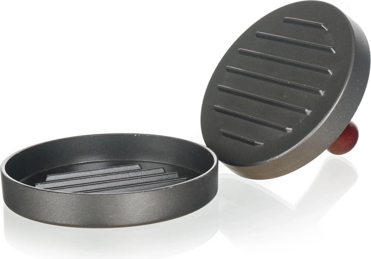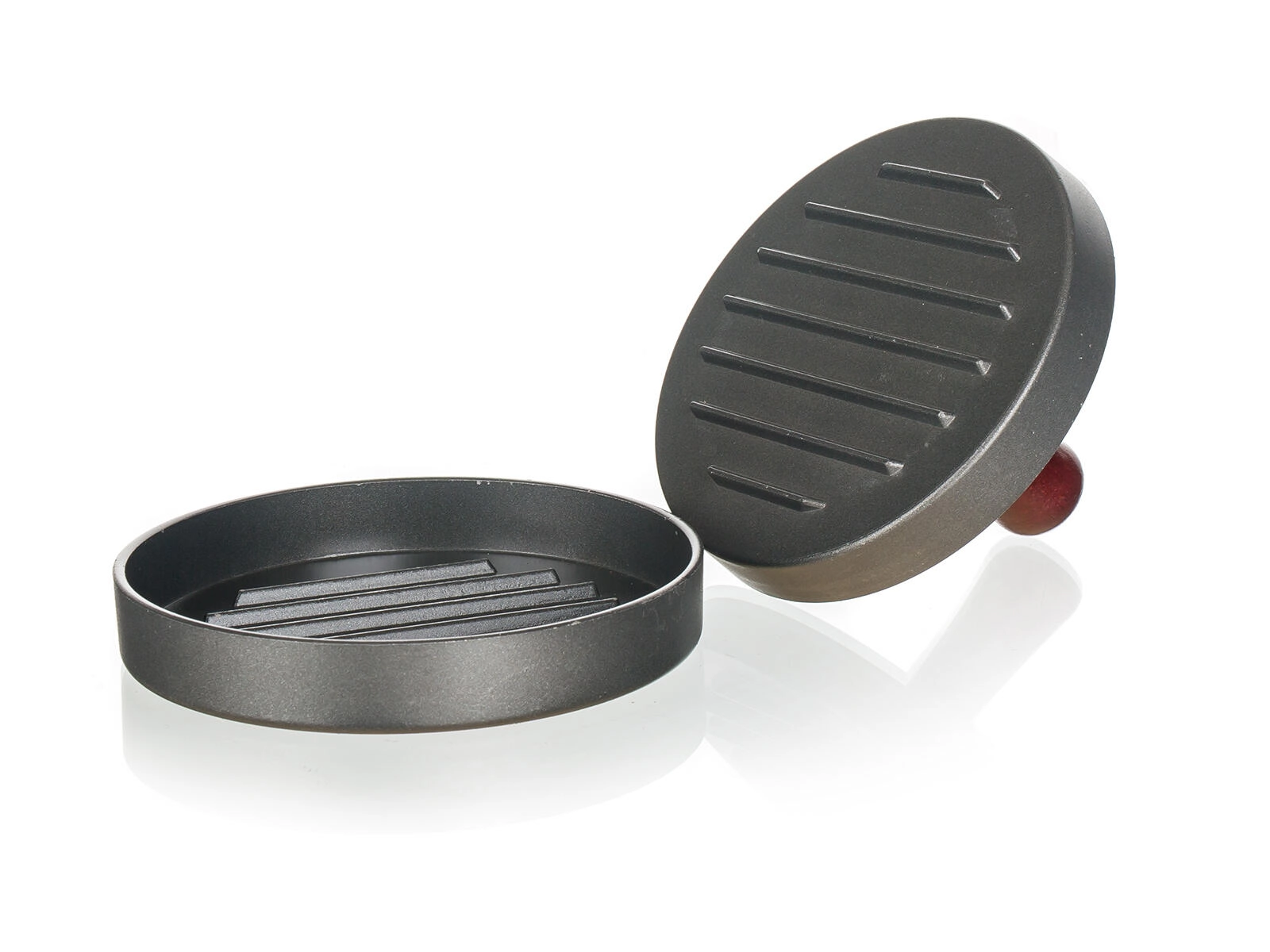 La presse répartit la viande de façon homogène sur toute la surface, pour des galettes de burger d’épaisseur et de forme identiques – une cuisson régulière à la poêle comme au grill.