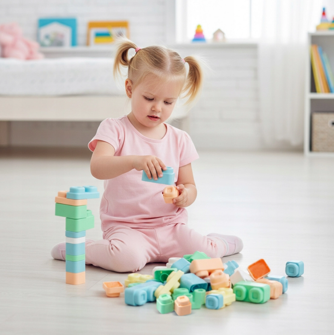 Le matériau est souple, flexible et certifié, permettant aux enfants d’écraser, mordre ou lancer les cubes et les tapis en toute sécurité, sans risque de blessure. Les éléments se connectent et se séparent facilement, ce qui renforce la motricité fine, la coordination œil-main et l’autonomie de jeu.