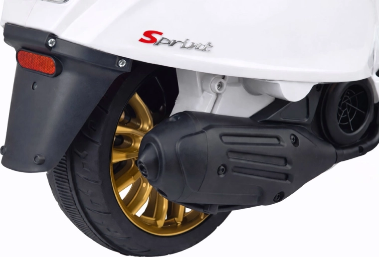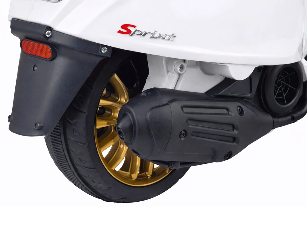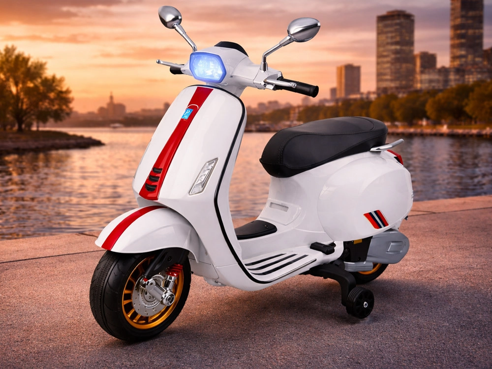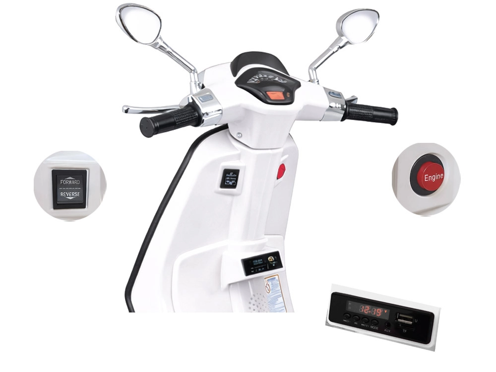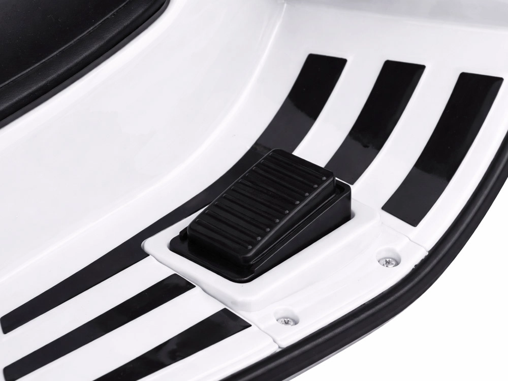 Le scooter électrique pour enfants au style VESPA allie design élégant et fonctions modernes. Il démarre par simple pression sur un bouton et la simulation du bruit du moteur crée une expérience de conduite authentique. La motorisation 2 × 12 V / 25 W et la batterie 12 V / 4,5 Ah assurent une conduite confortable et fluide, tandis que le phare avant apporte style et meilleure visibilité.