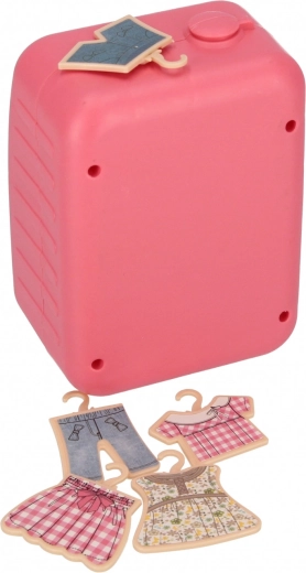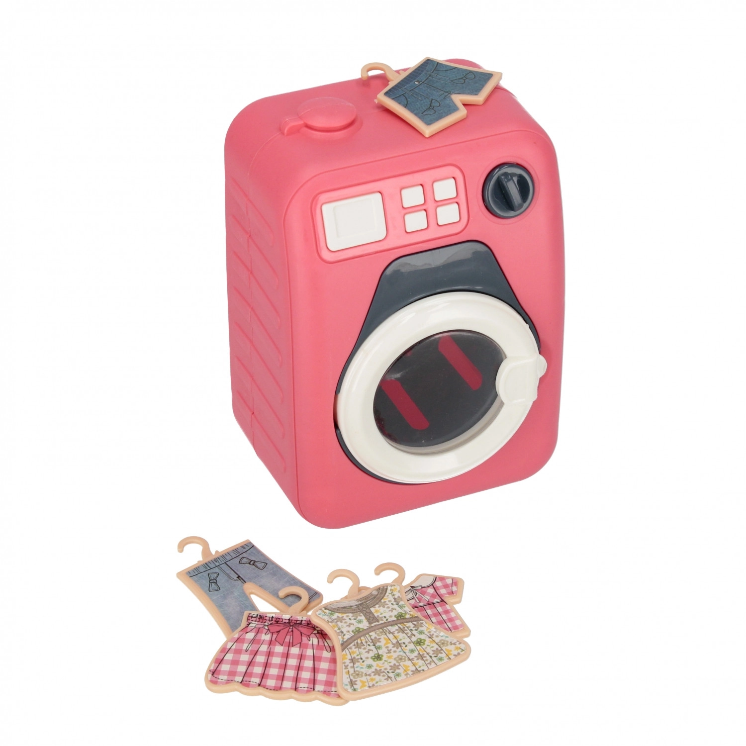 Machine à laver « frontale » rose avec hublot transparent et panneau de commande. Inclus : 5× cintre avec vêtements – les enfants peuvent laver, étendre et trier le linge.