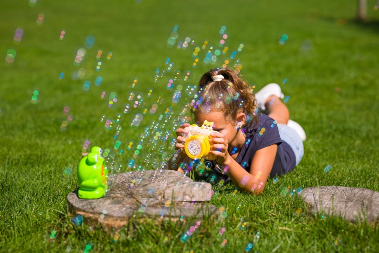 Son design léger et portable accompagne les enfants au jardin, au parc ou aux fêtes d’anniversaire. Des bulles colorées qui font sourire partout.