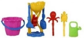 - Seau, moulin à sable, moules, tamis, arrosoir, pelle, râteau