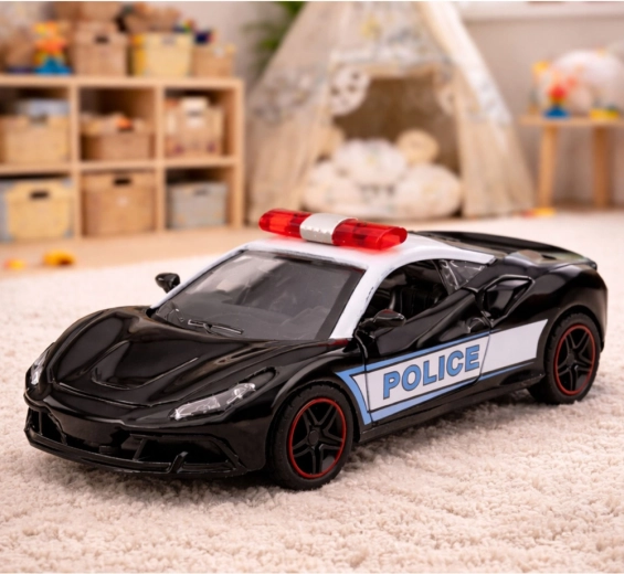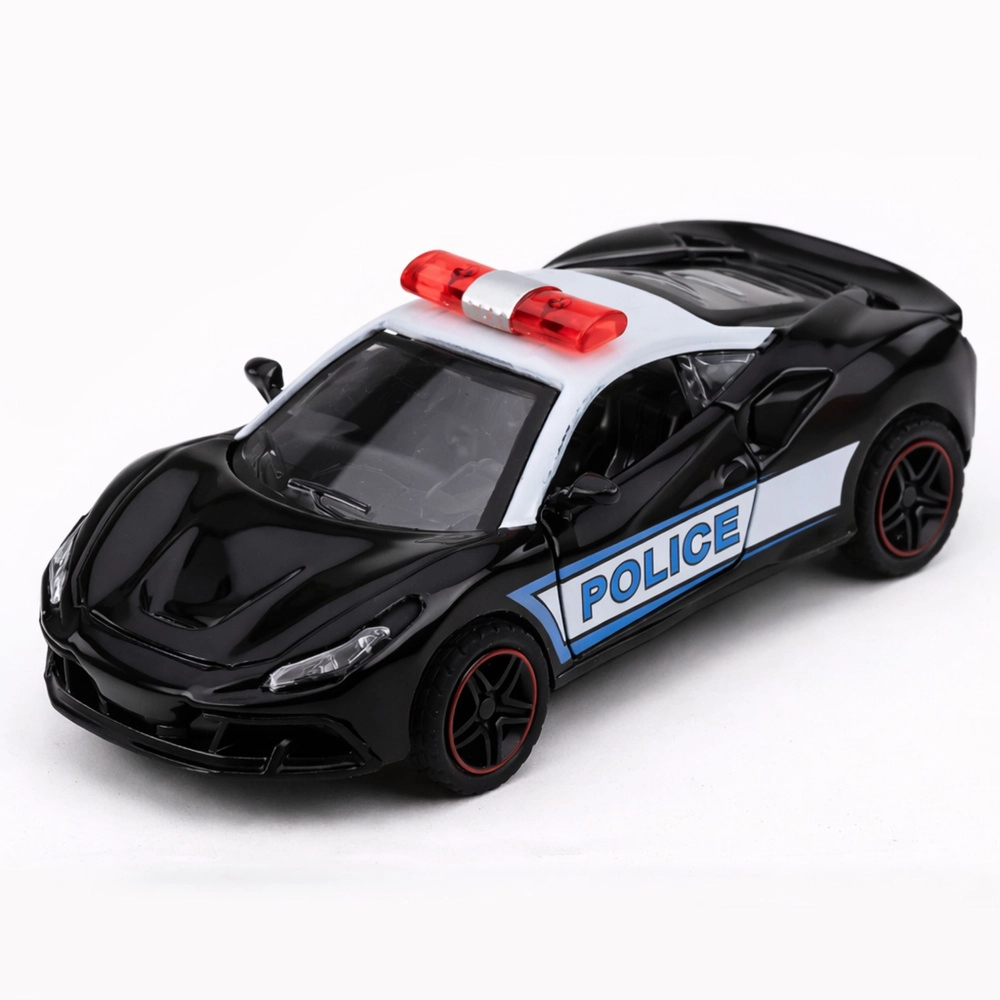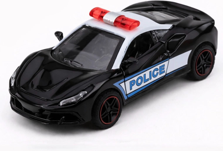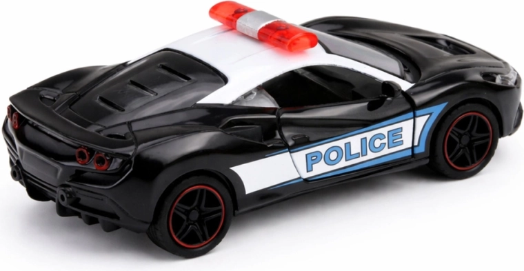 Modèle de police sportif en noir et blanc avec inscriptions POLICE bien visibles et rampe lumineuse sur le toit, au design moderne et à la finition de qualité. La carrosserie en métal associée à un plastique résistant prolonge la durée de vie du jouet et améliore sa stabilité en mouvement.