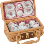 Élégant ensemble café en porcelaine dans une valise en osier avec un motif romantique. Idéal pour les jeux d'enfants lors de pique-niques ou de goûters avec des poupées.