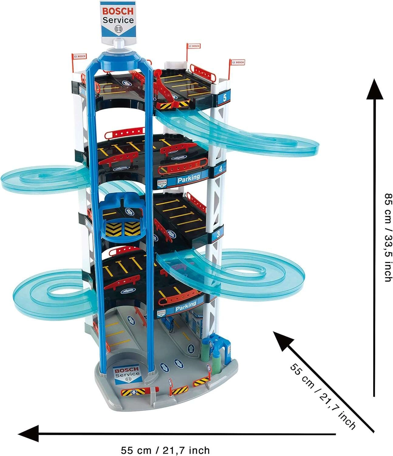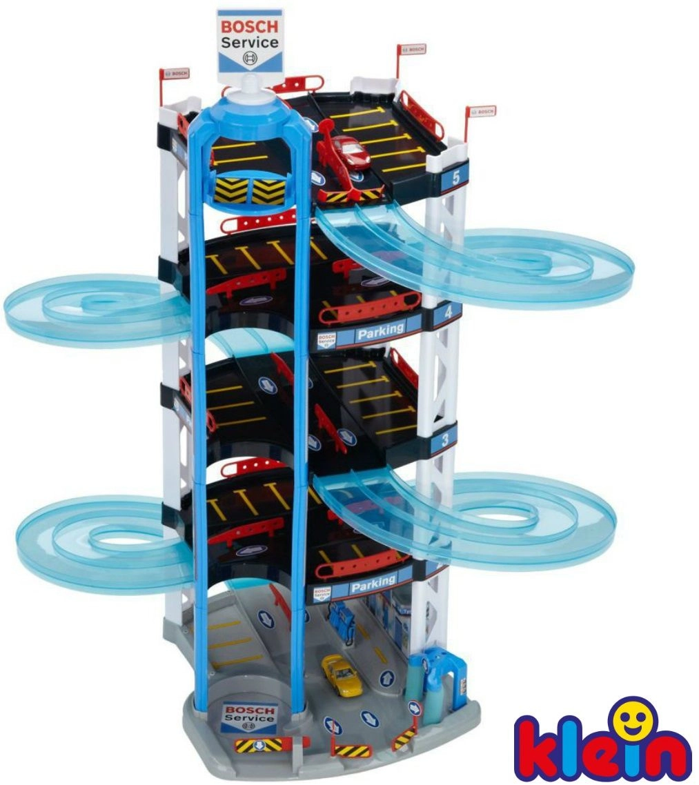 Ce robuste complexe de garage de stationnement à 5 étages BOSCH Service de la marque Klein est conçu pour les petits pilotes. Il propose des rampes hélicoïdales doubles semi-transparentes du niveau supérieur jusqu’en bas, un ascenseur à commande manuelle pour déplacer les voitures entre les étages et une zone de départ/arrivée pour deux petites voitures. Chaque niveau dispose de suffisamment de places de stationnement et le rez-de-chaussée comprend en plus une zone de service avec « station » pour un jeu réaliste.