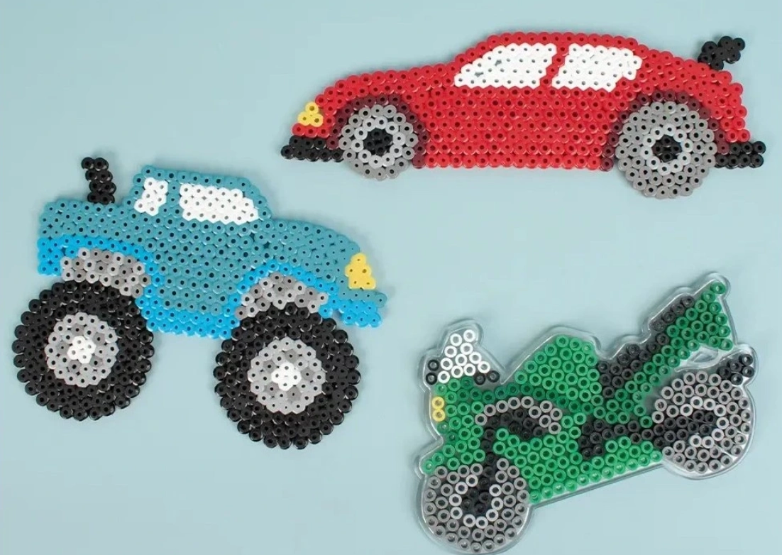 Les plaques transparentes PLAYBOX pour perles à repasser de 5 mm de diamètre facilitent la création de motifs de voitures et d’autres images. Elles sont résistantes, réutilisables et, grâce à leur transparence, permettent un travail aisé avec des gabarits à la maison, à l’école et dans les ateliers.