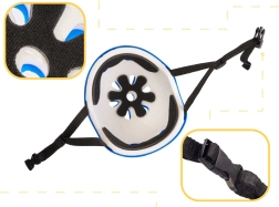 Les sangles réglables sous le menton facilitent l’ajustement de la taille et de la stabilité. L’ensemble comprend des protections de genoux, de coudes et de poignets qui diminuent le risque d’éraflures et de blessures lors de l’apprentissage comme lors d’une conduite plus dynamique.