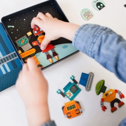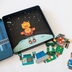 Ce coffret magnétique de robots est un excellent divertissement pour les enfants dès 3 ans. Grâce à plus de 25 pièces magnétiques, les petits constructeurs peuvent créer d’innombrables combinaisons de personnages robotiques, développant ainsi leur imagination et leur créativité. La boîte métallique se ferme solidement et renferme deux scènes colorées sur lesquelles les pièces adhèrent facilement.