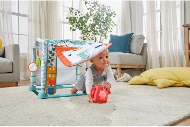 Fisher-Price tapis d’éveil 3-en-1 Maison de l’explorateur : 5 jouets, musique et lumières jusqu’à 20 min, tunnel pour ramper, tapis lavable. Stimule les sens et la motricité dès la naissance.