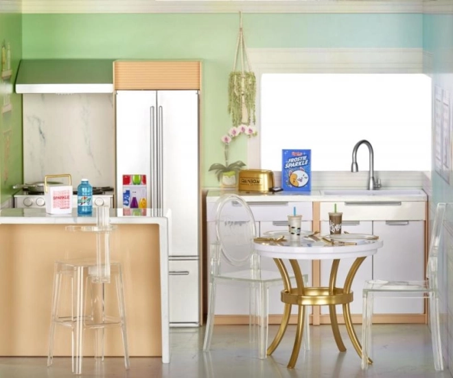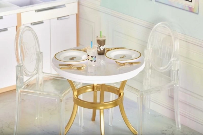 Lit, canapé, set de salle à manger, baignoire et accessoires de cuisine – tout assorti au style RAINBOW HIGH pour jouer immédiatement.