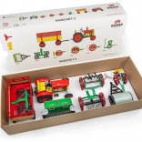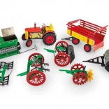Le set comprend un petit tracteur Zetor avec des jantes en plastique et un mécanisme à remontoir manuel, qui se tend avec une clé. Il offre trois vitesses différentes vers l'avant, une vitesse en marche arrière, une position neutre et un frein manuel. Les accessoires incluent: