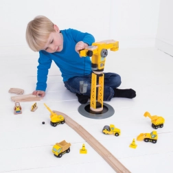 L’ensemble complète parfaitement les chambres d’enfants et les circuits de trains en bois – il est compatible avec les systèmes populaires. Les enfants peuvent charger et décharger les cargaisons, conduire le bulldozer, la benne ou le rouleau compresseur, réguler la circulation avec des cônes et des barrières et inventer leurs propres histoires de chantier.