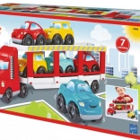 Attractif transporteur Abrick pour le transport de petites voitures ! Le transporteur est équipé d'une rampe rabattable qui permet un chargement et un déchargement faciles de six petites voitures colorées.