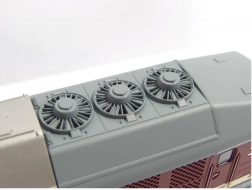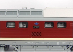 Modèle fidèle et détaillé de la locomotive diesel-électrique BR 132 « Ludmilla » en livrée DR. Il séduit notamment par des détails différenciant des autres variantes, tels que la rambarde sur la face avant, les détails des fenêtres frontales et latérales ainsi que la conception du toit. La peinture et les marquages, incluant tous les éléments décoratifs, sont de la plus haute qualité, conformes à la gamme Expert. Le modèle est équipé d’un moteur puissant doté de volants d’inertie ; le couple est transmis par des roues bandagées disposées en diagonale sur les essieux internes des bogies, tandis que quatre essieux sont moteurs. Associé à un long châssis en zinc moulé, cela garantit d’excellentes qualités de roulement. L’éclairage LED blanc/rouge change selon le sens de marche et la cabine de conduite est également éclairée. Le modèle peut être équipé d’un décodeur numérique spécifique avec module sonore et haut-parleur. Des voitures de type et de finition correspondants sont également disponibles. Caractéristiques principales : six essieux moteur avec deux volants d’inertie deux roues motrices bandagées éclairage avec inversion blanc/rouge selon le sens de marche éclairage intérieur interface PluX22 selon NEM 658 boîtier NEM 362 avec cinématique d’attelage court Documentation : Brochure des modèles BR 132/BR 232 (DE) Informations générales sur la BR 130 (DE, EN, F, NL) Essai du modèle dans le magazine Miniaturbahnen 2/2018 (DE) Notice d’utilisation et liste des pièces détachées du modèle n° 52760 (DE, EN, F, NL)