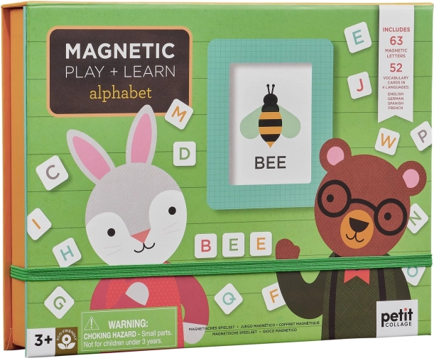 Apprenez l’alphabet aux enfants de manière ludique avec le set portable Petit Collage. Il contient 52 cartes illustrées avec des mots et 63 lettres magnétiques en quatre langues. Grâce aux illustrations joyeuses et aux lettres colorées, l’apprentissage devient un jeu d’enfant. Recommandé à partir de 3 ans.