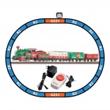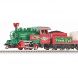 Locomotive à vapeur 0-4-0 avec tender, voiture voyageurs et deux wagons de fret dans un design festif harmonisé. Parfait pour créer instantanément l’atmosphère.