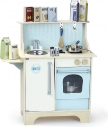 Cette élégante cuisine pour enfants de couleur bleue ravira les petits cuisiniers et cuisinières. Elle offre une structure en bois robuste, des cadrans du four qui cliquettent, un évier et un four ainsi qu’un riche assortiment d’accessoires pour un jeu réaliste. Convient dès 3 ans.
