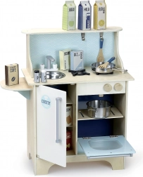 Grâce à sa structure en bois robuste, la cuisine est stable et durable. Elle comprend une toque et un tablier de chef, une salière et une poivrière, une spatule, une casserole, une poêle et des aliments en briques carton type tetrapak – tout est prêt pour cuisiner en s’amusant. Un assemblage simple est nécessaire après déballage.