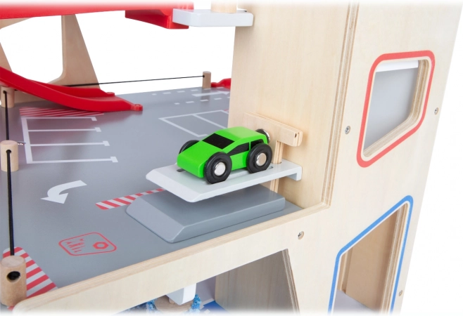 Ce parking premium en contreplaqué de qualité propose trois niveaux richement équipés reliés par un ascenseur fonctionnel et deux rampes fluides. Les enfants peuvent se garer, faire le plein, recharger, laver et réparer – tout au même endroit, avec des éléments réalistes et une excellente jouabilité.