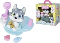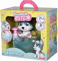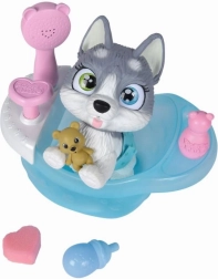 Chiot Husky Pamper Petz dans la baignoire - le compagnon idéal pour un bain amusant ! Un adorable bébé chien avec une fonction de boire et de faire pipi, qui captivera les enfants avec son interactivité et sa fonctionnalité ludique.