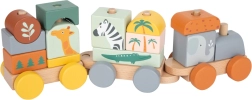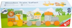 Le train en bois Safari est illustré dans des couleurs pastel avec des motifs d'animaux de safari, rendant le jouet visuellement attrayant pour les jeunes enfants.