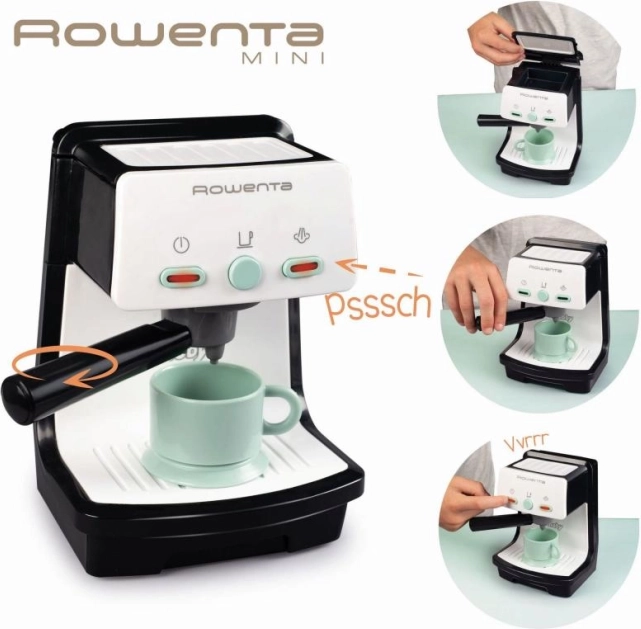 Réplique fidèle pour petits baristas : la machine à expresso pour enfants ROWENTA à piles propose un interrupteur rétroéclairé, des effets sonores réalistes et un porte-filtre amovible – tasse incluse. Dimensions compactes 10,5 × 10,4 × 18 cm.