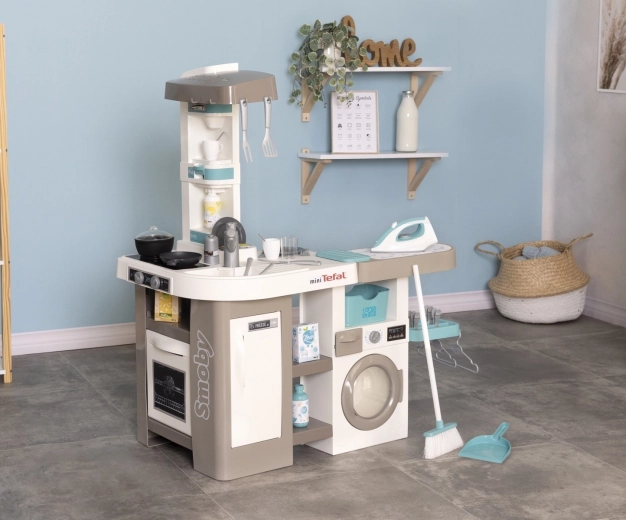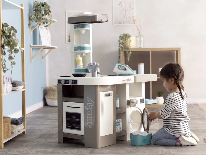 La cuisine pour enfants multifonction SMOBY TEFAL Studio 2 en 1 combine cuisson, lavage et repassage dans un seul set de jeu. Elle propose une plaque de cuisson électronique avec sons, un four, un réfrigérateur, un évier et une machine à café, ainsi qu’une buanderie avec machine à laver, étendoir et planche à repasser avec fer mécanique. Elle inclut 36 accessoires pour un jeu réaliste et le développement de l’imagination des enfants.