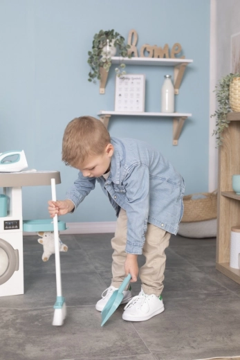 La machine à laver avec porte ouvrante et compartiment pour lessive est complétée par une planche à repasser avec fer mécanique, un étendoir et un panier à linge – un soin du linge complet au format enfant.