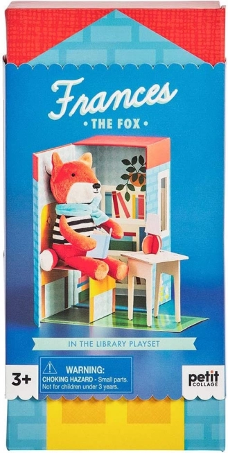 Renard en peluche Frances de Petit Collage avec scène de bibliothèque et livret en anglais lisible. Doux compagnon, scène 3D et superbe jeu pour enfants dès 3 ans.