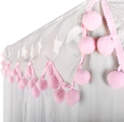 Le tapis spacieux et les parois aérées assurent le confort pour un ou plusieurs enfants – on y place aisément des coussins, peluches et livres. La tente convient parfaitement à l’intérieur comme au jardin sous la surveillance d’un adulte. Les pompons décoratifs et la possibilité de nouer les voilages apportent style au jeu et préservent l’intimité.