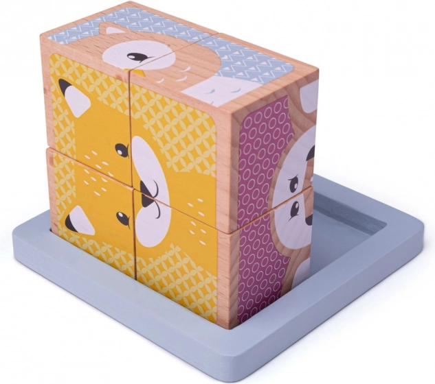 Cubes en bois Woodland offrent six images différentes d’animaux de la forêt, développant la dextérité et les capacités d’association. Il suffit de faire pivoter et d’assembler les cubes pour s’amuser à la maison comme en voyage !