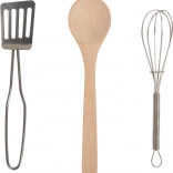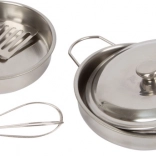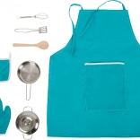 Ce vaste set de cuisine comprend une casserole avec couvercle, une poêle, un fouet, une spatule et une cuillère en bois. Il inclut également un tablier pour enfant, un sous-plat et une manique en tissu. Un accessoire idéal pour des jeux créatifs dans une cuisine pour enfants.