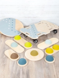 Les deux boules en bois vissables peuvent être placées à différents emplacements sur la face inférieure de la planche. Vous adaptez ainsi facilement le niveau de difficulté à l’âge et aux capacités de l’enfant.