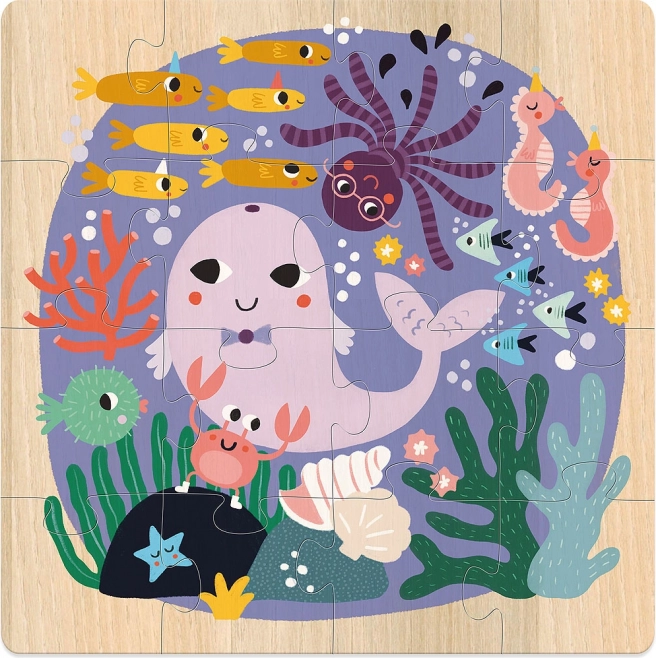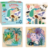 Découvrez le merveilleux monde de la nature grâce à cet ensemble de puzzles en bois. Chacune des trois images propose un thème différent : des aventures dans les nuages, le monde sous-marin et l’exploration de la jungle. La scène céleste ravit avec un magnifique paon, un aigle et d’autres oiseaux. Les motifs marins prennent vie avec une grande baleine, une pieuvre et de sympathiques petits poissons. La scène terrestre présente un tigre, un crocodile et un perroquet dans une joyeuse ambiance de jungle.