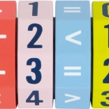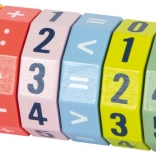 Six anneaux rotatifs avec chiffres et symboles permettent de créer des exercices d’addition, de soustraction, de multiplication et de division jusqu’à 99 – une manière ludique d’en comprendre les bases.