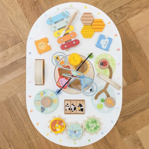 - Surface de jeu multifonction : labyrinthe de perles, jeu d’encastrement, xylophone avec baguette, engrenages, éléments coulissants et rotatifs.