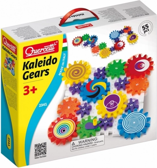 Le jeu de construction Quercetti Kaleido Gears se compose de plaques perforées, d’axes, d’engrenages et de figurines représentant différents animaux et arbres. Grâce à une manivelle, le mécanisme peut être mis en mouvement, permettant aux enfants d’explorer les principes mécaniques de base et de comprendre la relation de cause à effet.