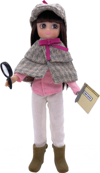 • Modèle de détective : manteau à carreaux marron-vert décoré d’un nœud rose, casquette, chemise rose, pantalon beige, bottes marron, carnet de notes, stylo et autocollants avec empreintes digitales.
