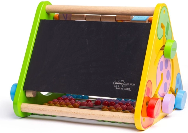 Triangle d’activité en bois BIGJIGS BABY : 5 activités en 1, alphabet en anglais, abaque, dessin. Robuste, sûr, 27×27×23 cm, dès 12 mois.