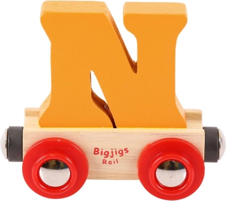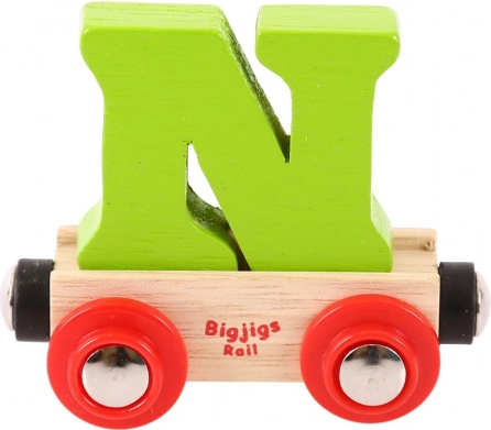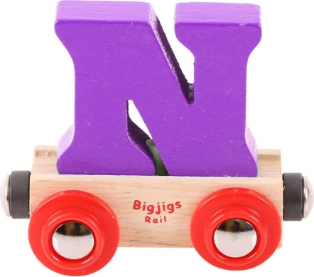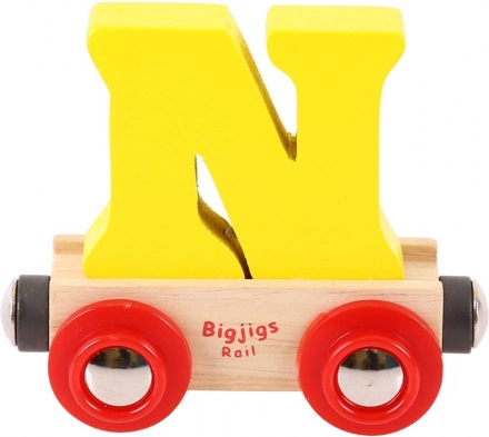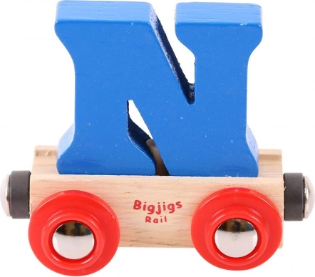Wagon Bigjigs Rail avec la lettre N pour circuits de train en bois. Lettre amovible, compatibilité magnétique, couleurs vives, bois de qualité. Âge 3+.