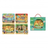 Puzzle en bois sur le thème du zoo offrant un divertissement pour les enfants dès 2 ans. Il comprend quatre puzzles, chacun composé de six pièces, et est rangé de manière pratique dans une boîte en bois avec une poignée en coton.