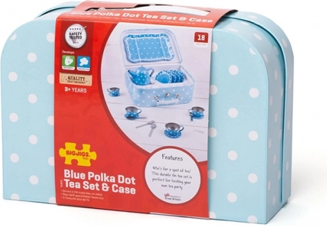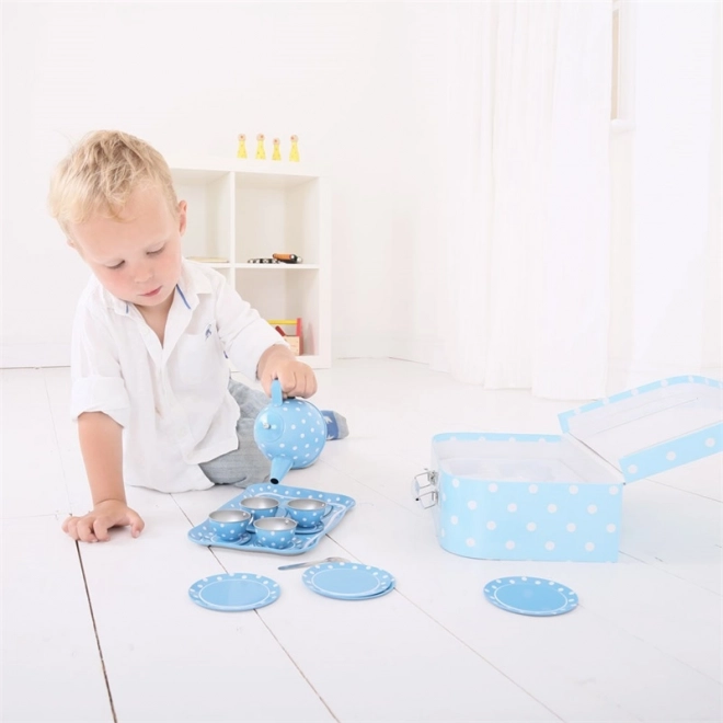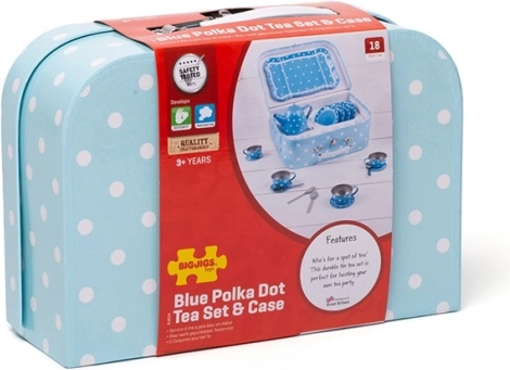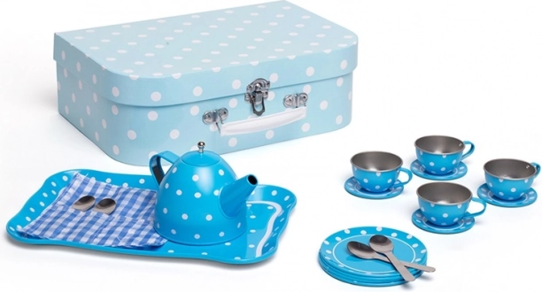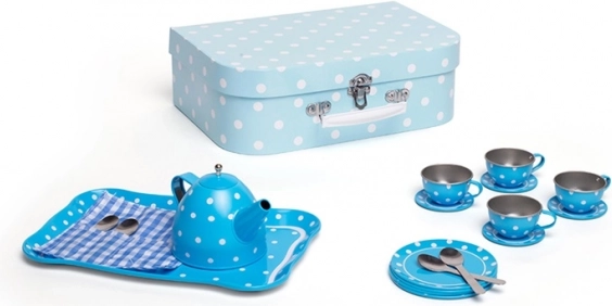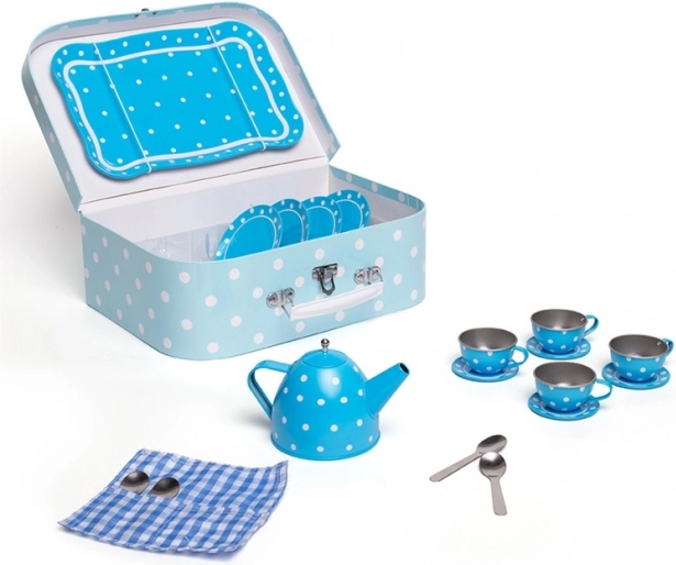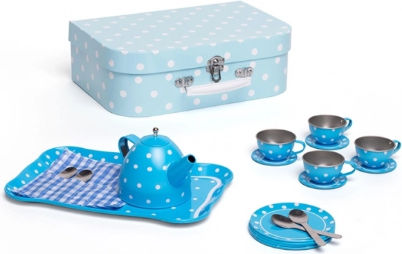 Un élégant service à thé bleu à pois dans une valisette rigide ravira chaque petit hôte. Il contient tout le nécessaire pour de parfaits « goûters-thé » d’enfants – de la théière aux tasses et soucoupes. Grâce à sa fabrication en métal, l’ensemble est résistant, facile à transporter et idéal pour les voyages. Le jeu stimule la créativité, l’imagination et les compétences sociales et répond aux normes de sécurité européennes.