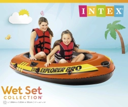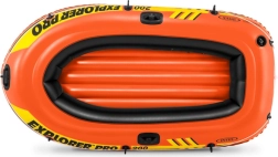 Canot pneumatique pratique pour deux personnes. Le canot possède un fond gonflable, une corde de maintien tout autour, des poignées solides, une poignée à la proue, des supports pour rames, trois chambres à air avec valve double. En avant à bord.