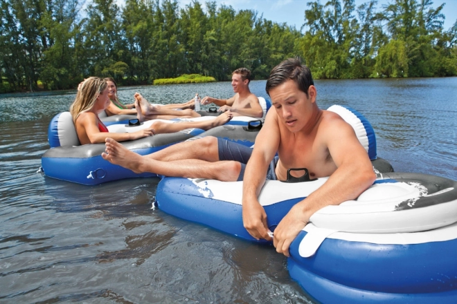 Fabriqué en vinyle massif préalablement testé. Taille approximative 1,30 m x 1,26 m. Ce n’est pas un jouet, destiné aux loisirs sportifs. Poignées solides. Facile à connecter à d’autres produits River Run. Deux chambres à air, porte-gobelet. Rustine incluse.
