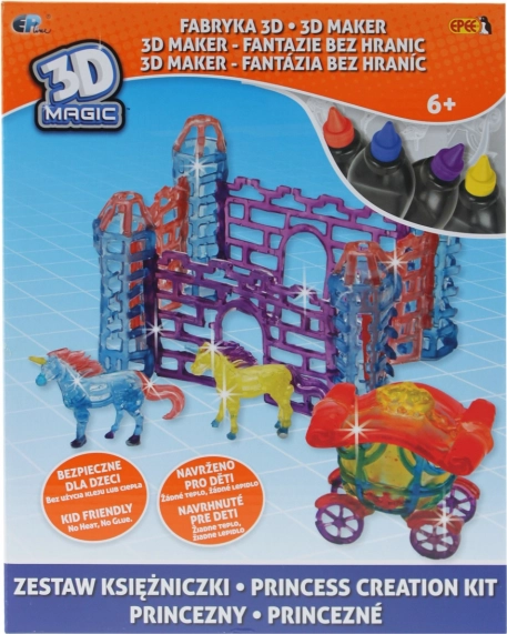 Avec 3D MagiDeluxe, créez facilement des modèles 3D originaux – des châteaux aux carrosses en passant par des personnages magiques. Il suffit d’utiliser le gel 3D Magic, de choisir un moule ou un gabarit et de laisser l’objet durcir sous la lumière UV. Le résultat est solide, coloré et prêt à être joué ou exposé.