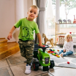 La remorque amovible, le râteau, la pelle et les autocollants permettent aux enfants de personnaliser leur tracteur et de profiter d’un jeu encore plus varié.