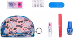 La trousse zippée compacte accueille fards, vernis, gloss, rouge à lèvres, lime et stickers – idéale à la maison comme en déplacement.