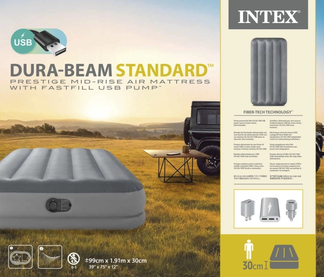 Matelas gonflable de dimensions 99 cm x 1,91 m x 30 cm. Capacité de charge maximale 136 kg. Temps de gonflage 3,5 minutes. Gonflage, dégonflage et stockage faciles. Pompe électrique intégrée.