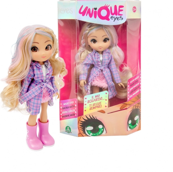Découvrez la magie de la poupée Unique Eyes – une poupée stylée de 25 cm avec des yeux magiques qui vous suivent, de longs cheveux soyeux et une tenue à la mode avec des chaussures. Disponible en 3 versions différentes, idéale pour les enfants à partir de 3 ans.
