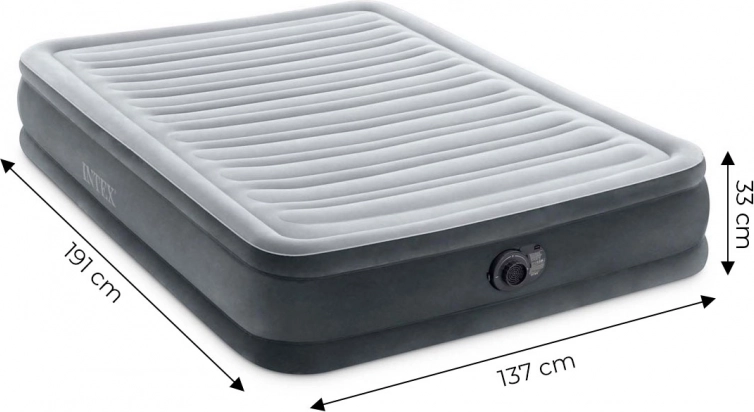 Le matelas gonflable INTEX est idéal comme couchage d’appoint confortable pour les invités ou pour le camping. La pompe intégrée 220–240 V assure un gonflage rapide en env. 4,5 minutes et un dégonflage automatique sans effort. La surface en velours est douce au toucher, tandis que le PVC robuste garantit une longue durée de vie et un entretien facile.
